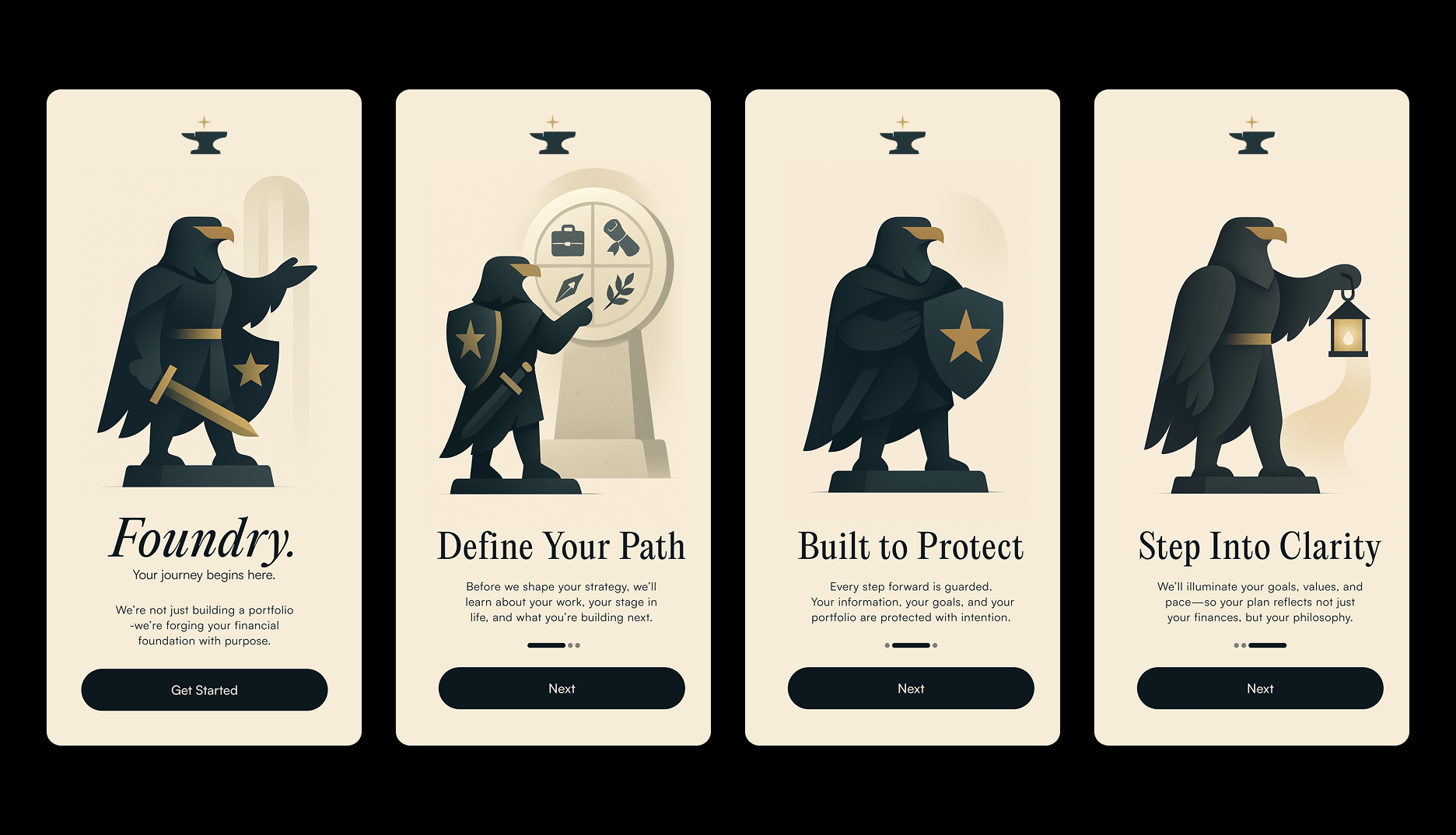 The Foundry onboarding flow was designed to transform a traditionally dry and compliance-heavy financial intake into a guided, symbolic journey rooted in clarity and trust. Inspired by archetypes of ceremony and self-declaration, I created a multi-step flow that progressively gathers identity, employment, financial, and risk-related data without overwhelming the user. Each screen leverages expandable interactions, contextual inputs, and a consistent visual rhythm—ensuring users feel both protected and understood. The result is a seamless account setup experience that blends precision, narrative, and elegance—aligning with Foundry’s mission to offer values-driven finance with intention.